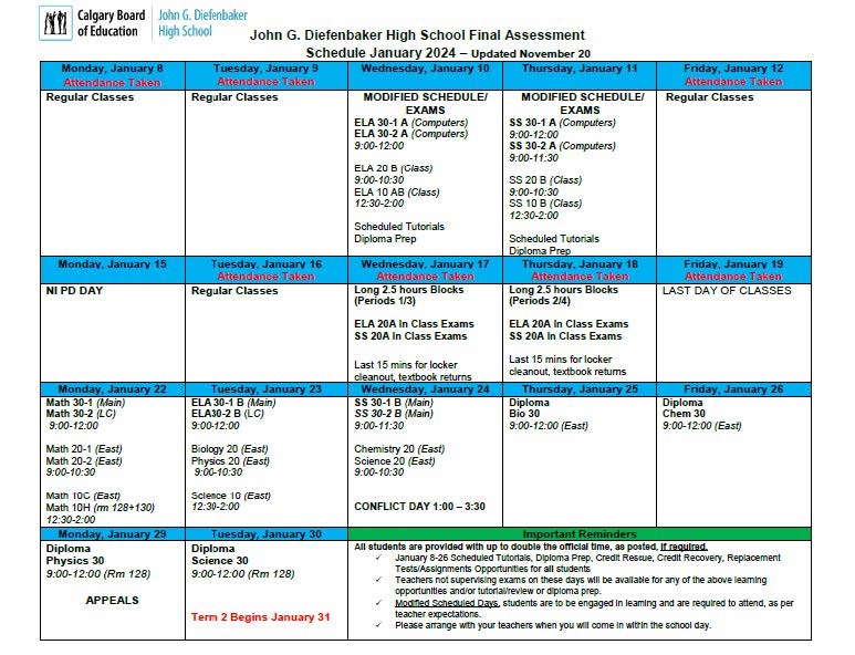 Any questions regarding exams, please speak to Assistant Principal Ms. Turner in the Main Office, or email her directly cjturner@cbe.ab.ca